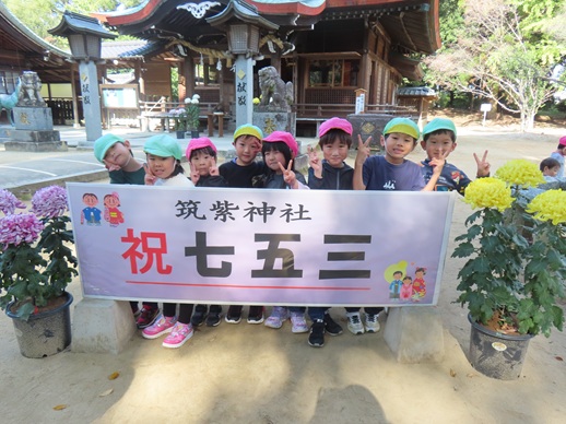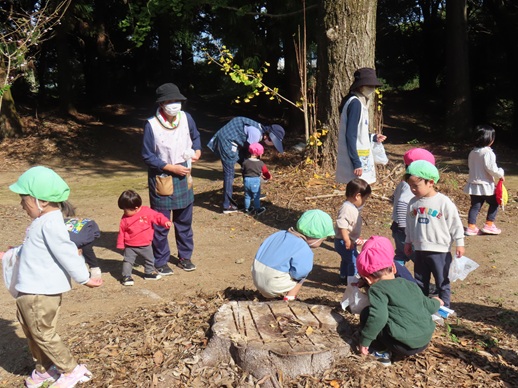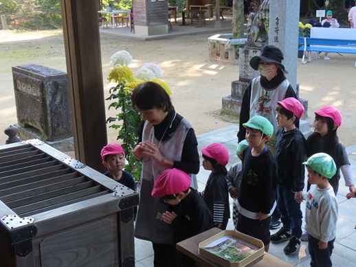 みんなでお参りをして、どんぐりを拾ったりして遊びました。